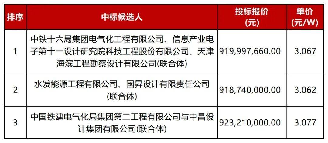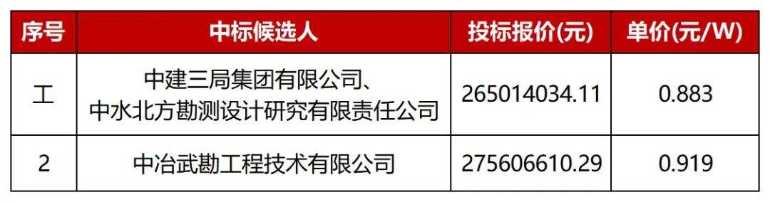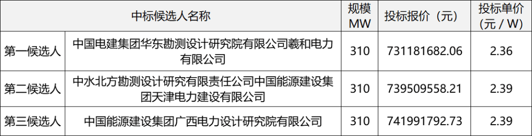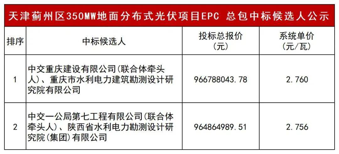 项目7名称:滨海新区轻纺城1号至6号300兆瓦分布式光伏电坐项目EPC总承包中标人:中国电建集团贵州工程无限公司&中国电建集团河南省电力勘测设想院无限公司结合体项目10名称:平易近勤100万千瓦风光电一体化项目50万千瓦光伏发电项目EPC总承包中标人:中铁第一勘测设想院集团无限公司&中建八局总承包扶植无限公司结合体第一中标候选人:中交沉庆扶植无限公司(结合体牵头人)、水利电力建建勘测设想研究院无限公司